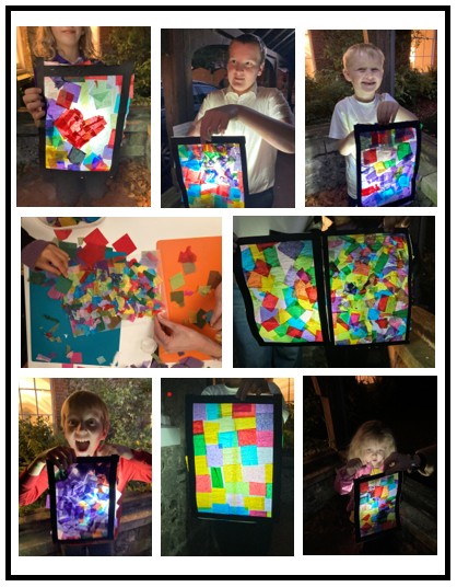 Everyone worked at their own pace, and each produced a beautiful and unique stained-glass window to take home. The awe and wonder came when we took their windows outside into the darkness of The Inner Close and shone a light through them. The children and adults were thrilled to see the effect and how beautiful their tissue paper designs looked.